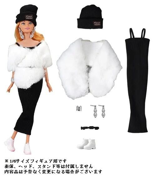 1/6サイズフィギュア用衣装 黒のパーティドレス&ニット帽&白のショール コスチュームセット