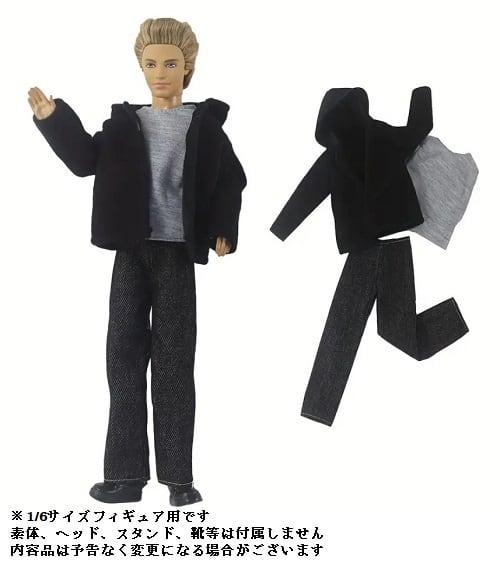 1/6サイズフィギュア用衣装 男性用 黒のパーカー&グレーシャツ&パンツ コスチュームセット